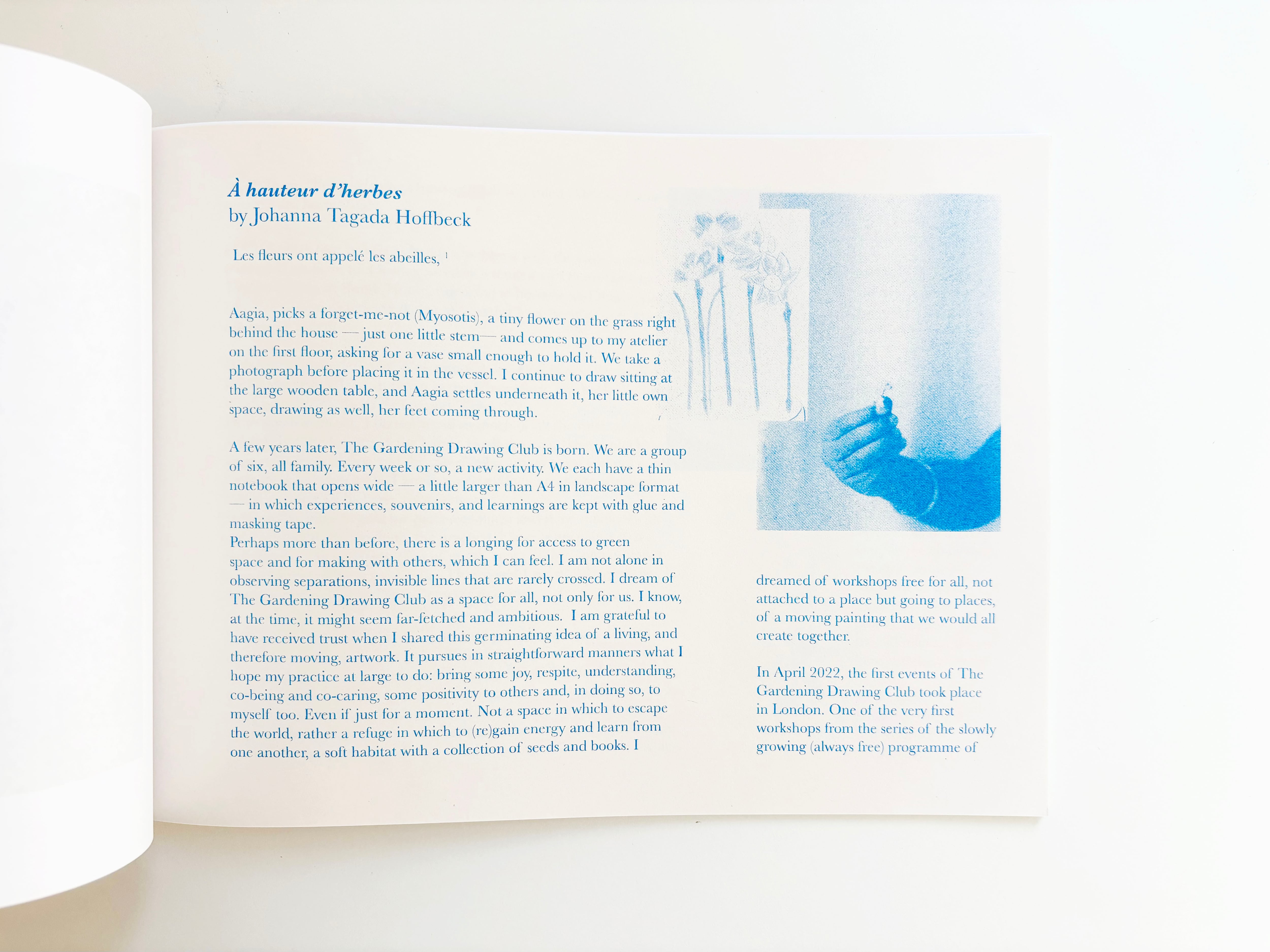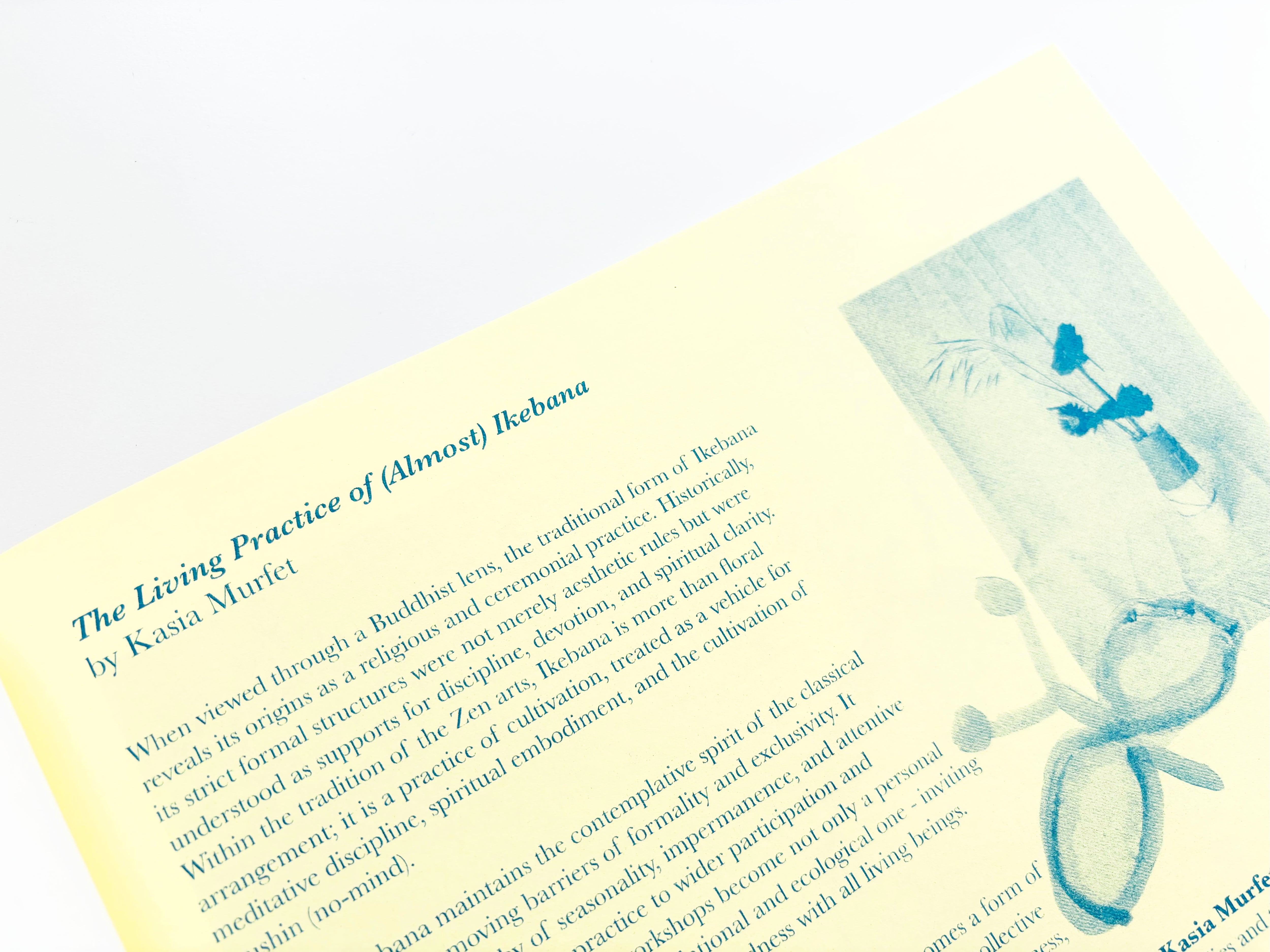 本書は、Tagada Hoffbeckの長年の制作と教育的実践に根ざし、The Gardening Drawing Clubの中で展開されてきたワークショップシリーズ「(Almost) Ikebana」から生まれました。このプロジェクトは、描くこと、観察すること、即興的な試み、花を生けること、人とのやりとりやお茶の時間を通して、敬意とユーモアをもって、生け花の新たな可能性を探る試みです。2022年以降、17回の無料公開ワークショップをはじめ、学校や大学、コミュニティでの活動を重ねてきました。